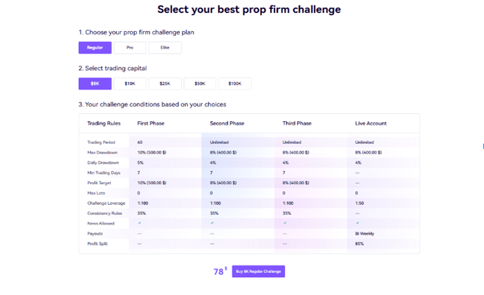With three distinct plans, Coinlocally Prop ensures every trader, from beginner to expert, can find the right path. From the first steps in the Regular Plan to the advanced challenges in Elite, the platform guides traders toward larger accounts and greater rewards.